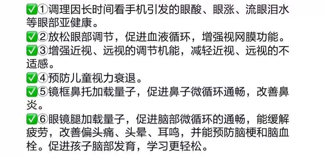 量子眼镜经过高科技量子舱能量植入后,用量子的高频振动特性促使眼部运动,激活眼部细胞组织,促进眼细胞的血液循环,增强眼部肌肉组织的弹性,促使眼外肌处于松弛状态,解除睫状肌的痉挛,巩膜被压现象得以缓解,通过对人体细胞的活化.