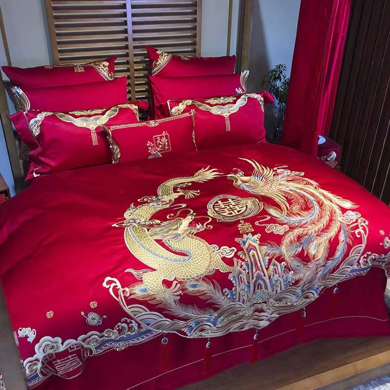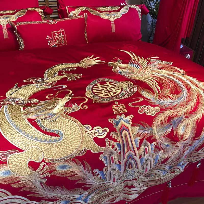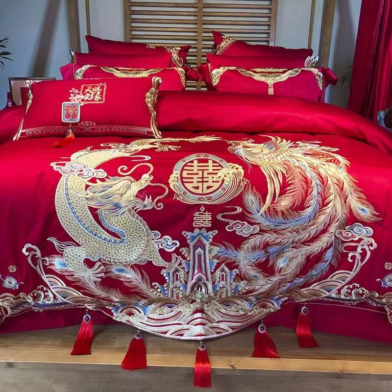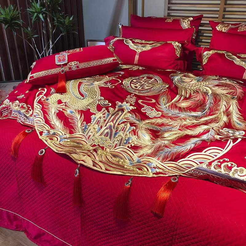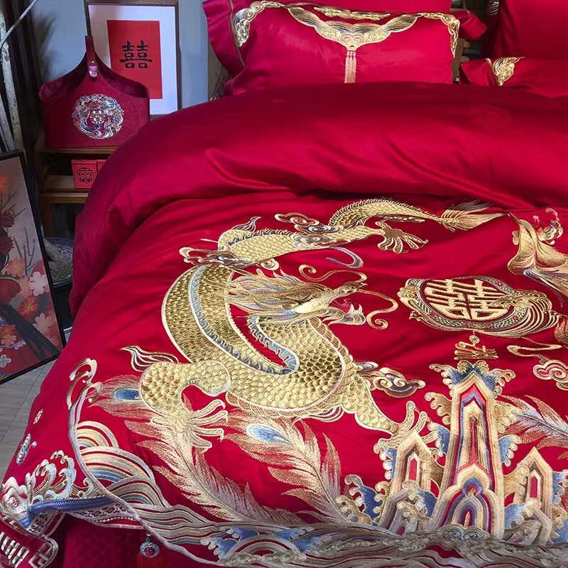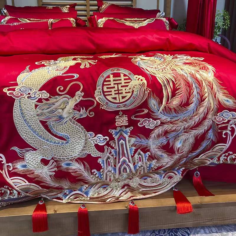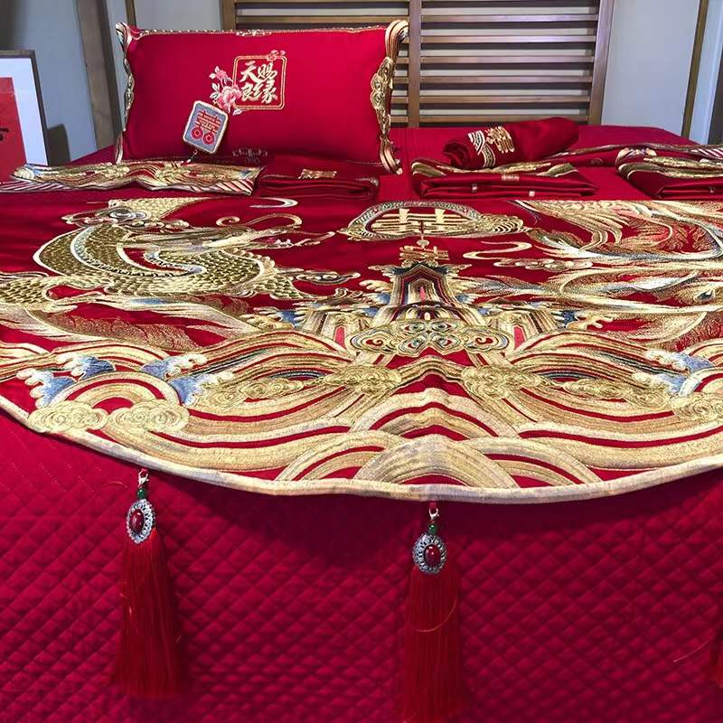 国内贸易 九喜狐婚庆家纺结婚四件套被婚床上用品贡缎提花龙凤刺绣十件套(200*2300)